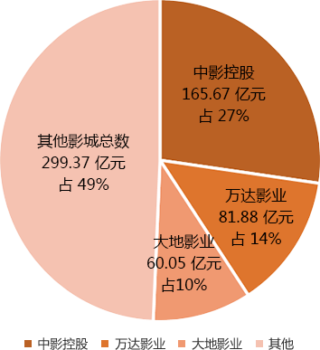 截止2018年底,中國排名前三的院線公司影院數、銀幕數、票房占市場份額百分比情況
